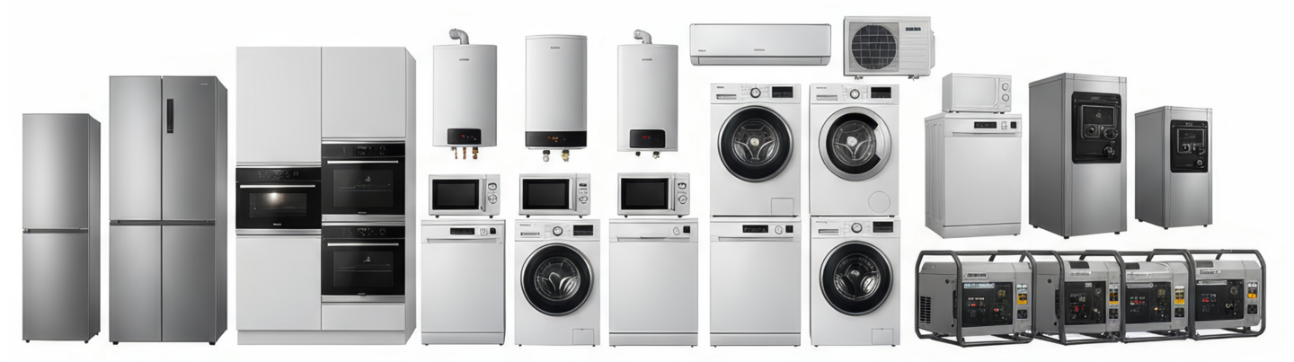 холодильники, камеры, печи, плиты, грильницы, пицца печи, пароконвектоматы, кофемашины, вентиляция, кондиционирование, ледогенераторы, посудомоечные машины, стиральные машины, сушильные машины, мясорубки, тестомесы, пилы, бойлеры, газовые котлы.